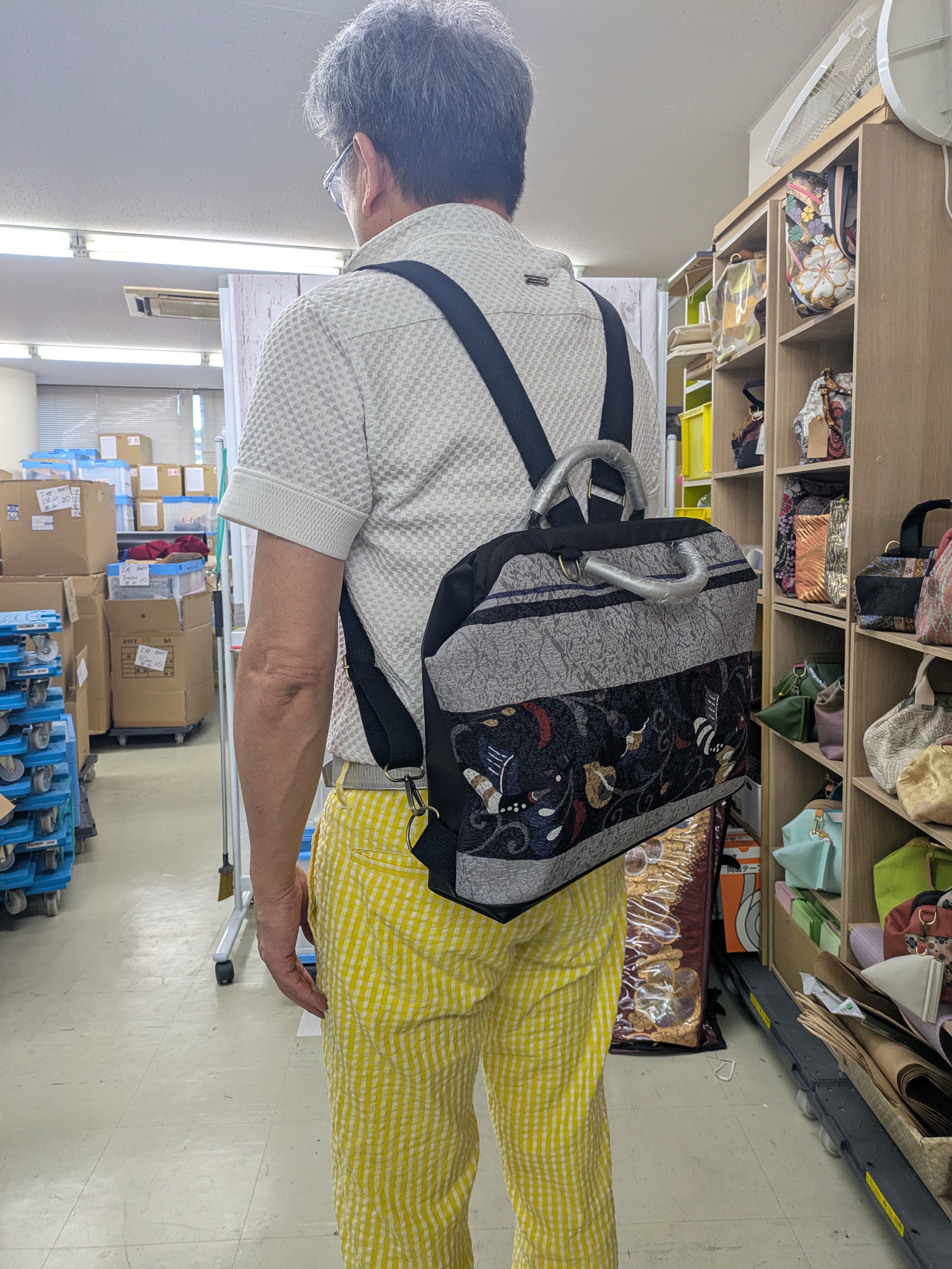 喜んで頂けるといいのですが‥‥既に他のバックに生地を使用し、生地の残りがちょうどのサイズで、この生地がいい!!とオーダーを頂いたものです。中のペンホルダーや、携帯用のポケットなど・・・内側のポケットに時間がかかりました。